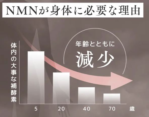 NMNは体内でNADという成分に変化するのですが、体内にあるNADは歳をとるにつれ減っていきNADが減ると老化現象が起こります。