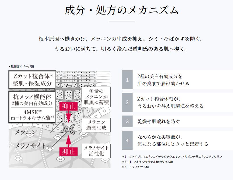 資生堂HAKUの美白美容液であるメラノフォーカスZには先程ご説明した4MSKとm-トラネキサム酸を混ぜたものを「抗メラノ機能体」とオトギリソウエキスが新たに配合されたZカット複合体が含まれていますので、HAKUシリーズの中でも1番シミに効果のある商品となっています!