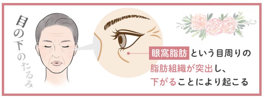目の下のたるみは眼窩脂肪という目の周りの脂肪組織が突出してしまい、下がることに起こってしまいます。