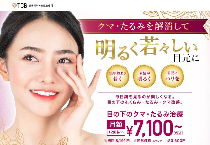 マスク生活になり目元は特に重視される世の中となっていますので、簡単に目の下のたるみを改善する方法としてTCB(東京中央美容外科)も選択肢の1つになるかと思います。